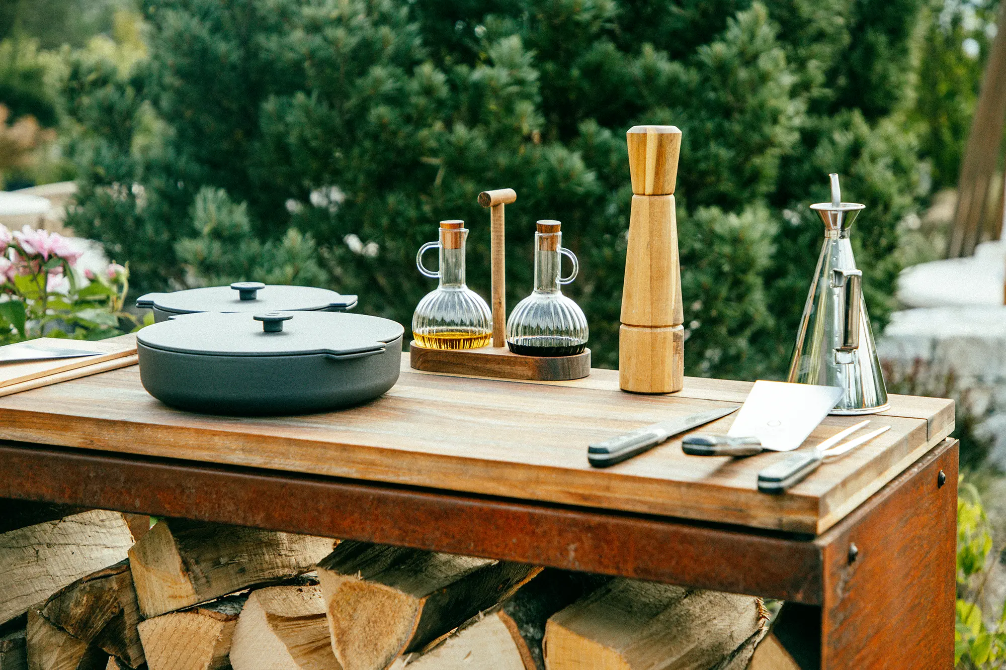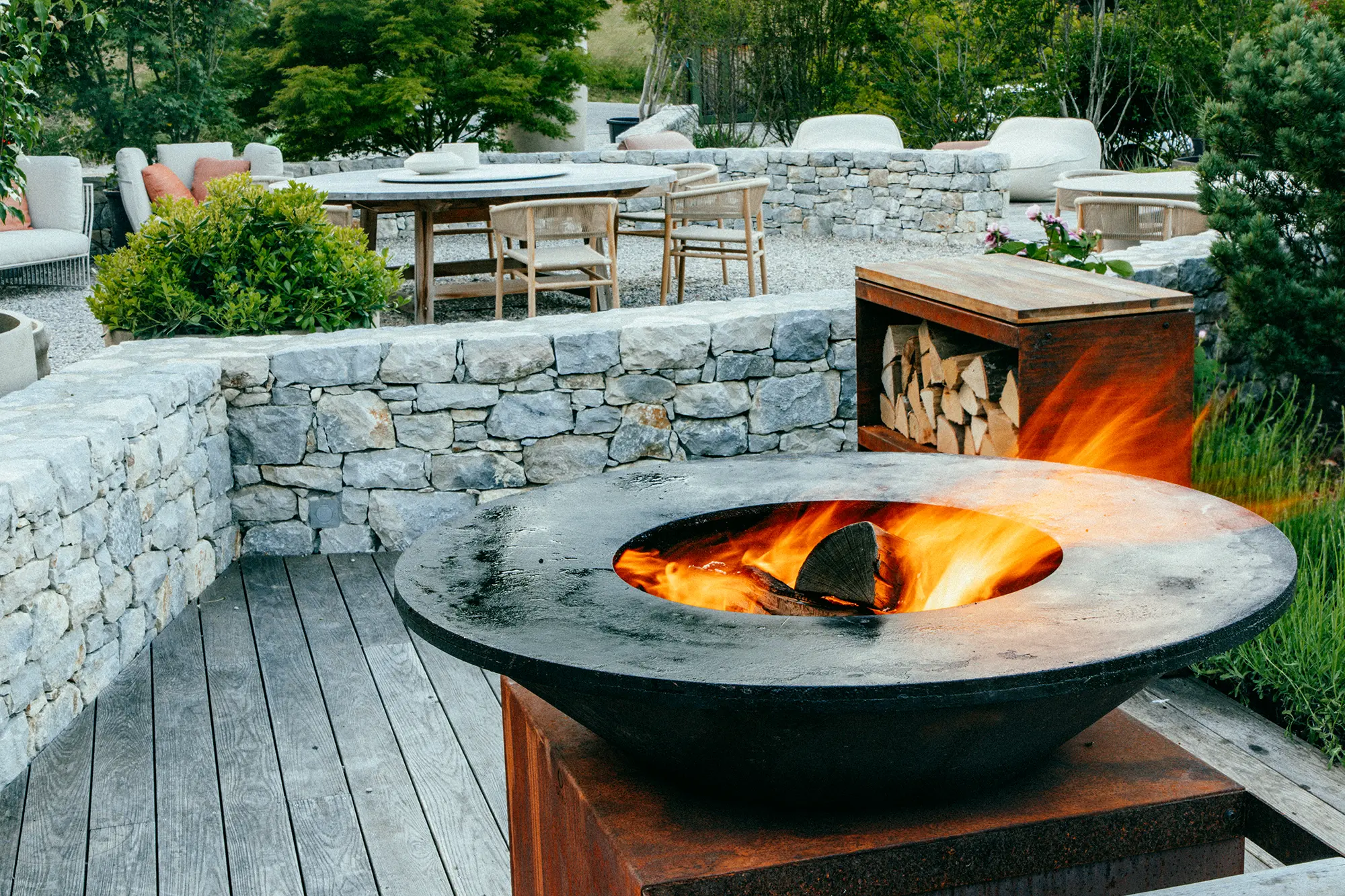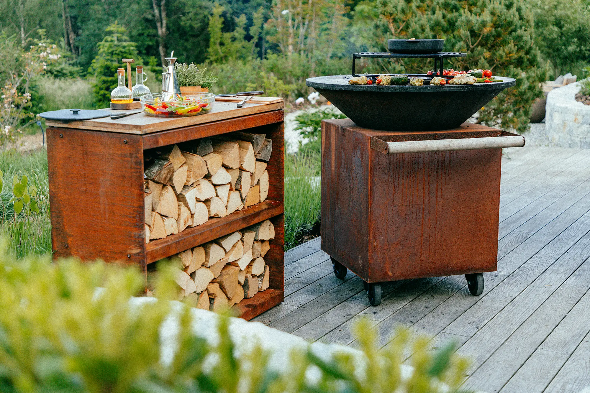 La cuisson s’organise autour du feu, favorisant une approche simple et maîtrisée qui met en valeur les produits et les saveurs. La cuisine extérieure devient un lieu central de partage, aussi bien dans des jardins privés que dans des projets professionnels ou hôteliers.