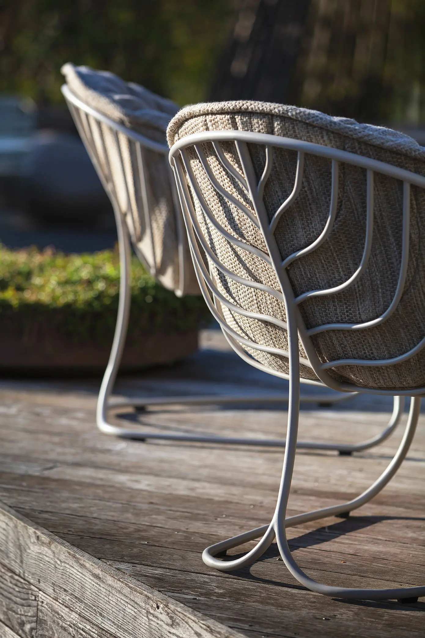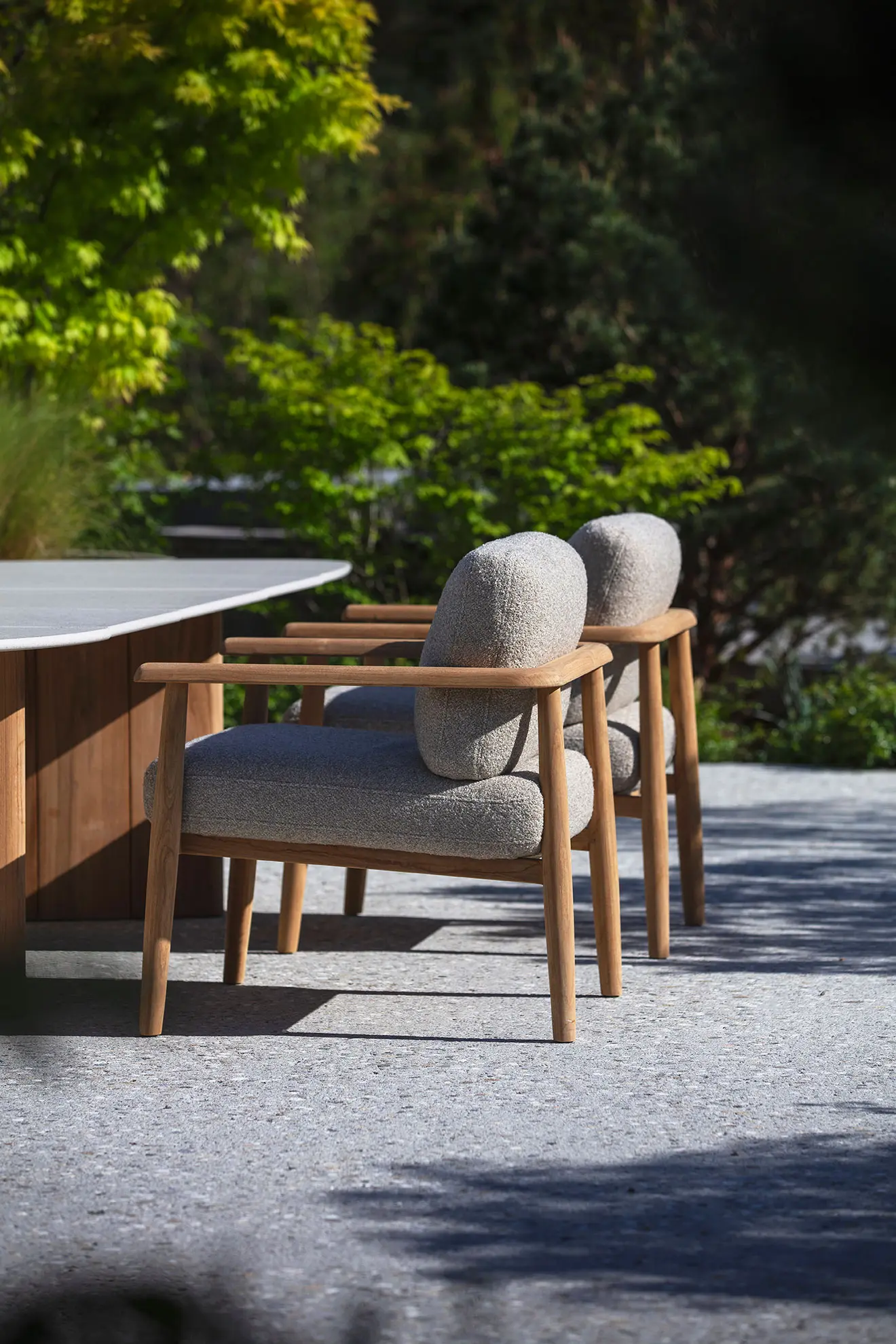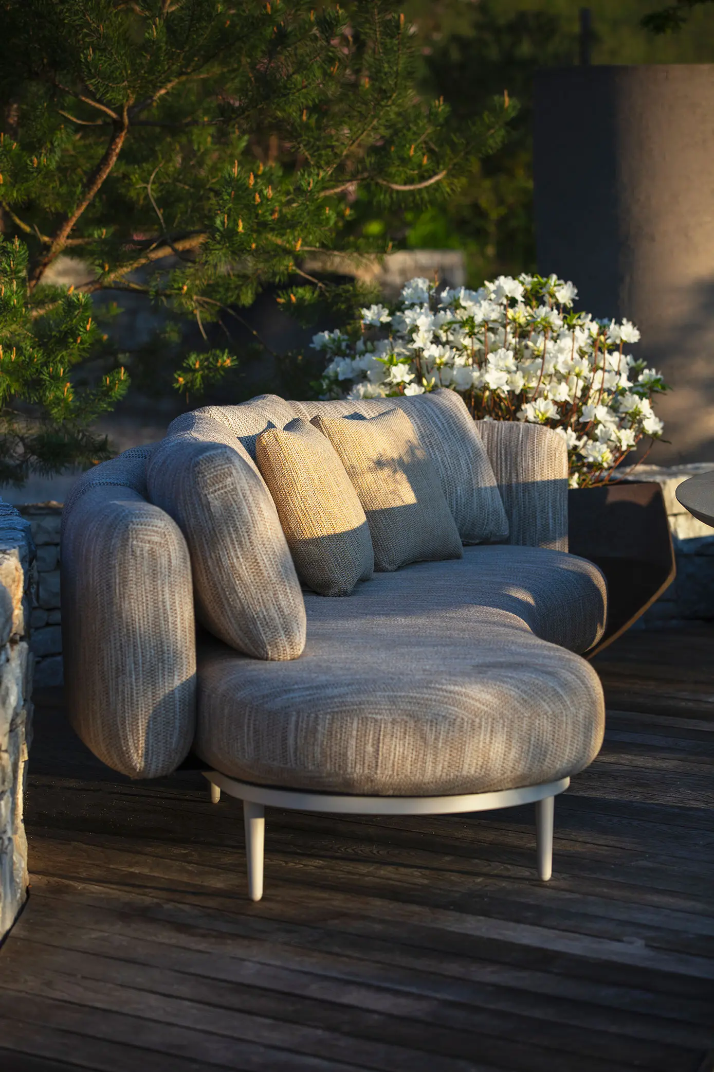 Les assises sont conçues pour offrir une sensation enveloppante, avec des tissus résistants, souples et durables, capables de conserver leur aspect et leur confort malgré une exposition régulière aux conditions extérieures. Les structures, aux proportions maîtrisées, sont dimensionnées pour un usage quotidien, sans compromis sur la stabilité.