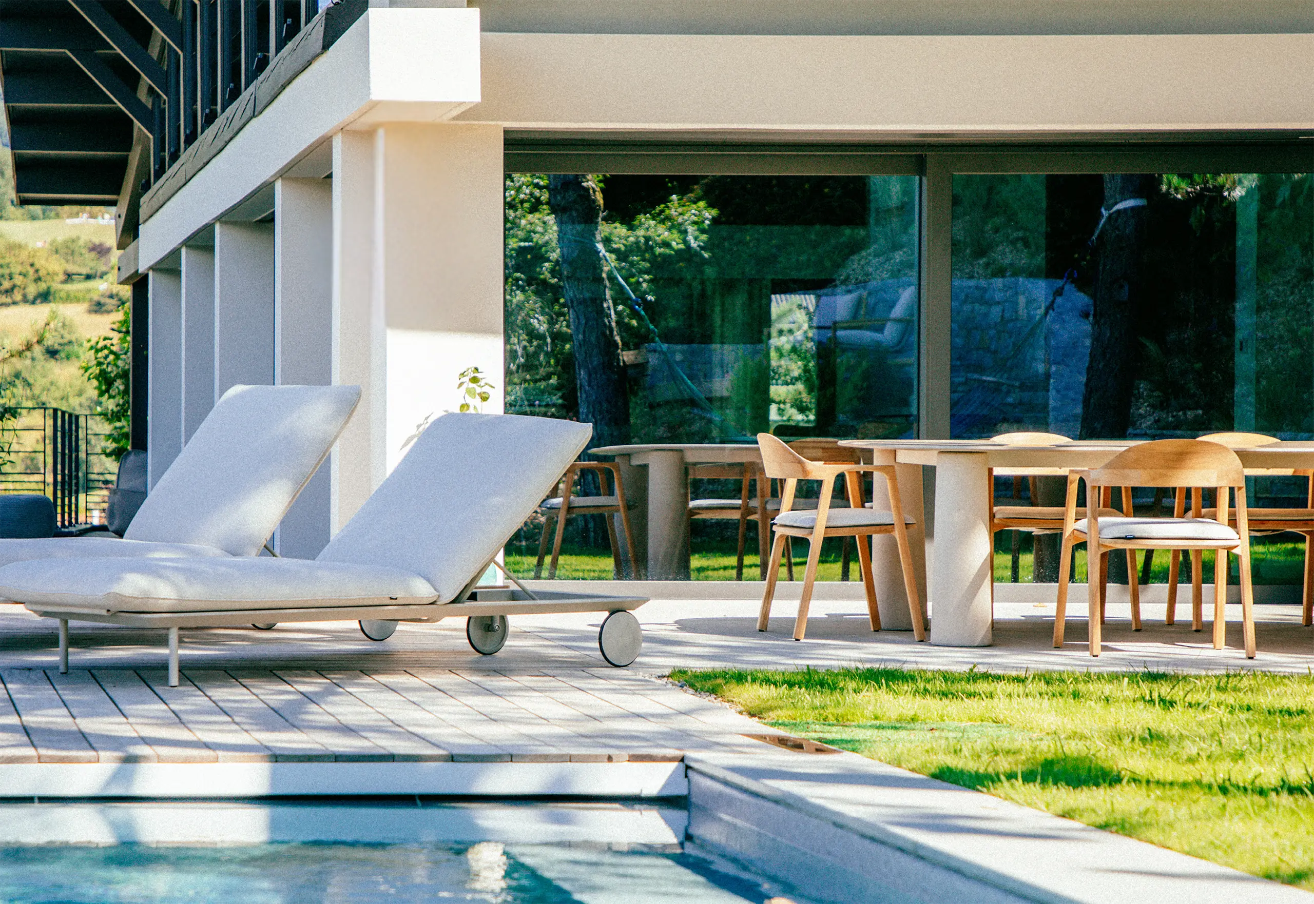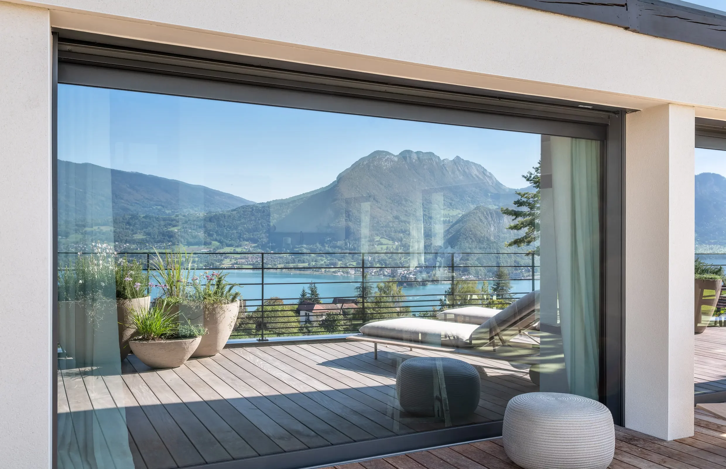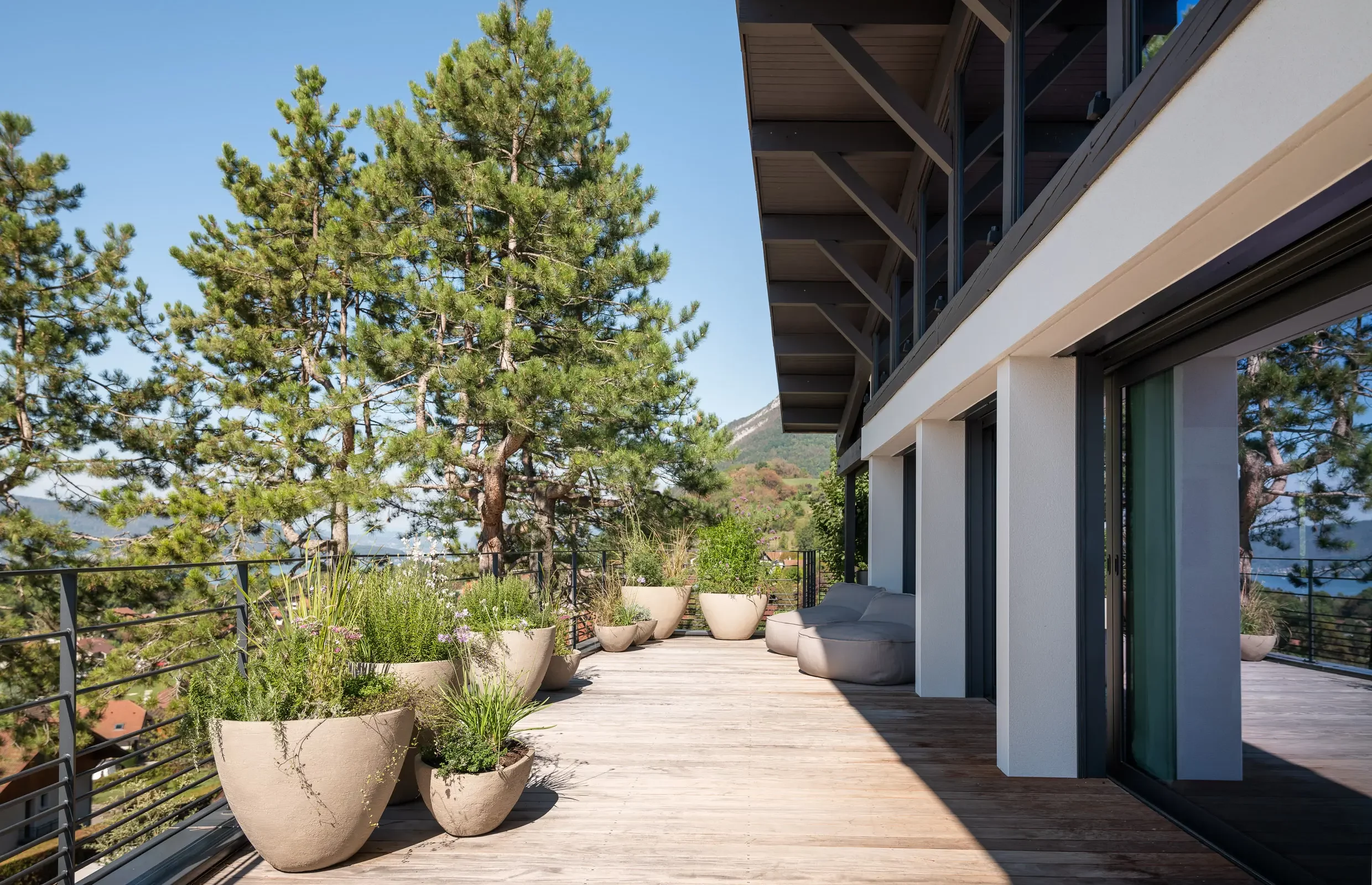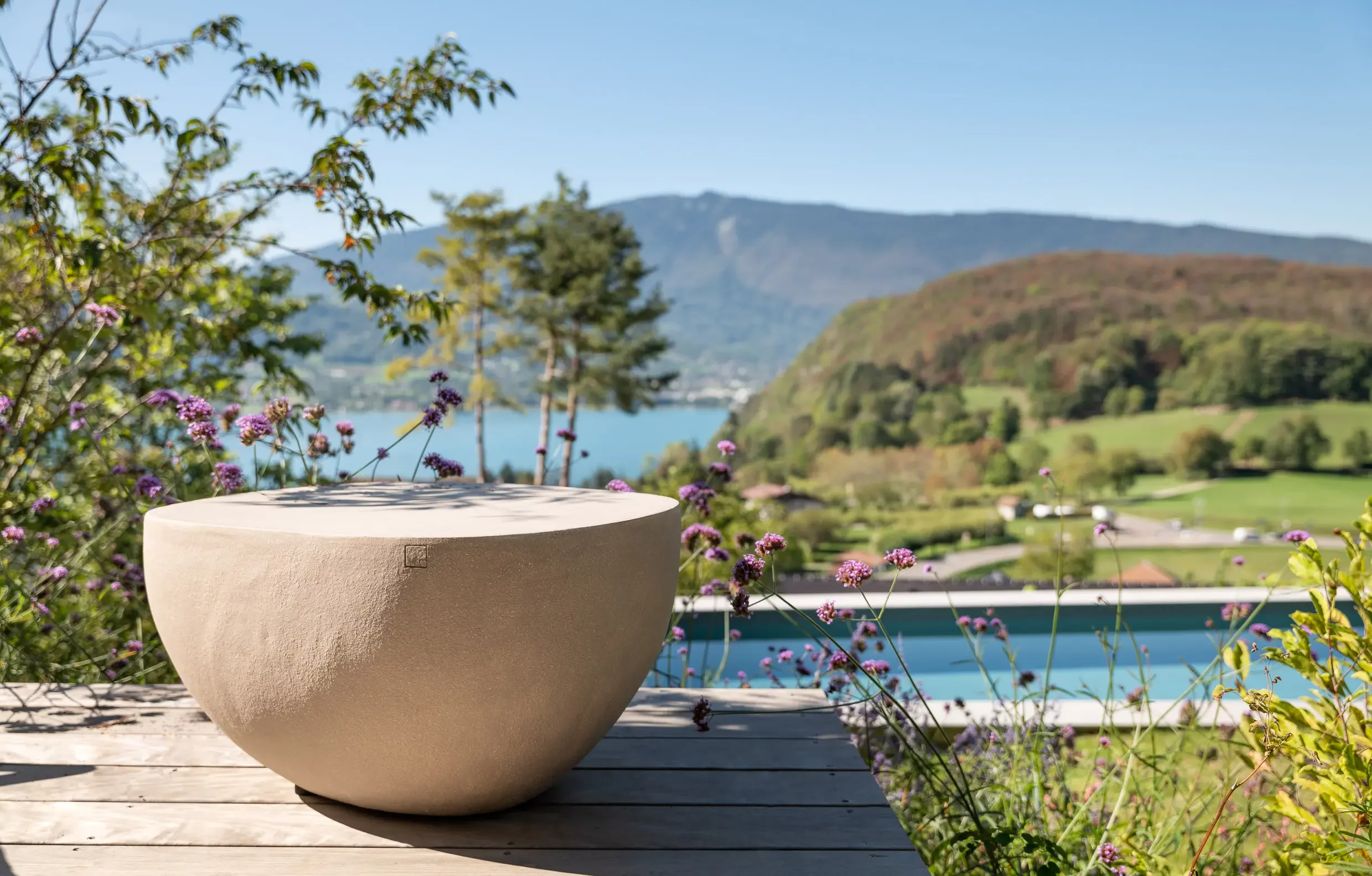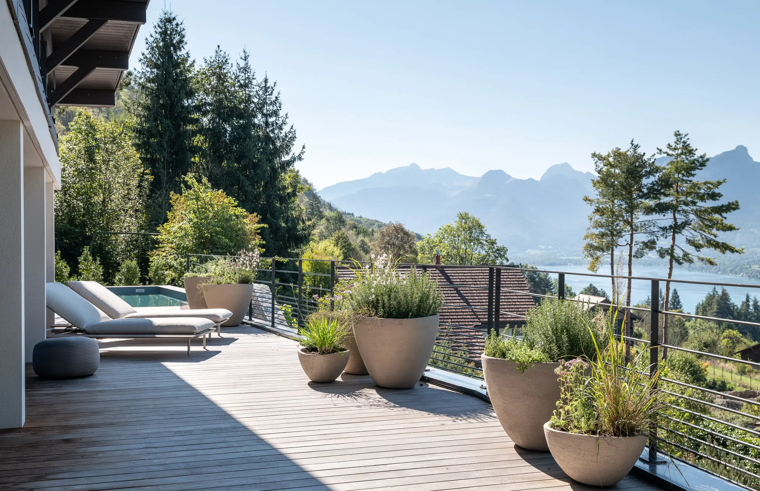 Surplombant la baie de Talloires, les espaces extérieurs de cette villa ont été aménagés pour profiter d’une vue plongeante sur le lac. Des bains de soleil, à la fois confortables et élégants, ont été installés près de la piscine. Sur la terrasse, des poufs ont été disposés près des pots, ajoutant une touche d’intimité. La table à manger, élément central de cette maison, a trouvé sa place sur la terrasse, mettant en valeur une alliance harmonieuse de pierre et de bois.